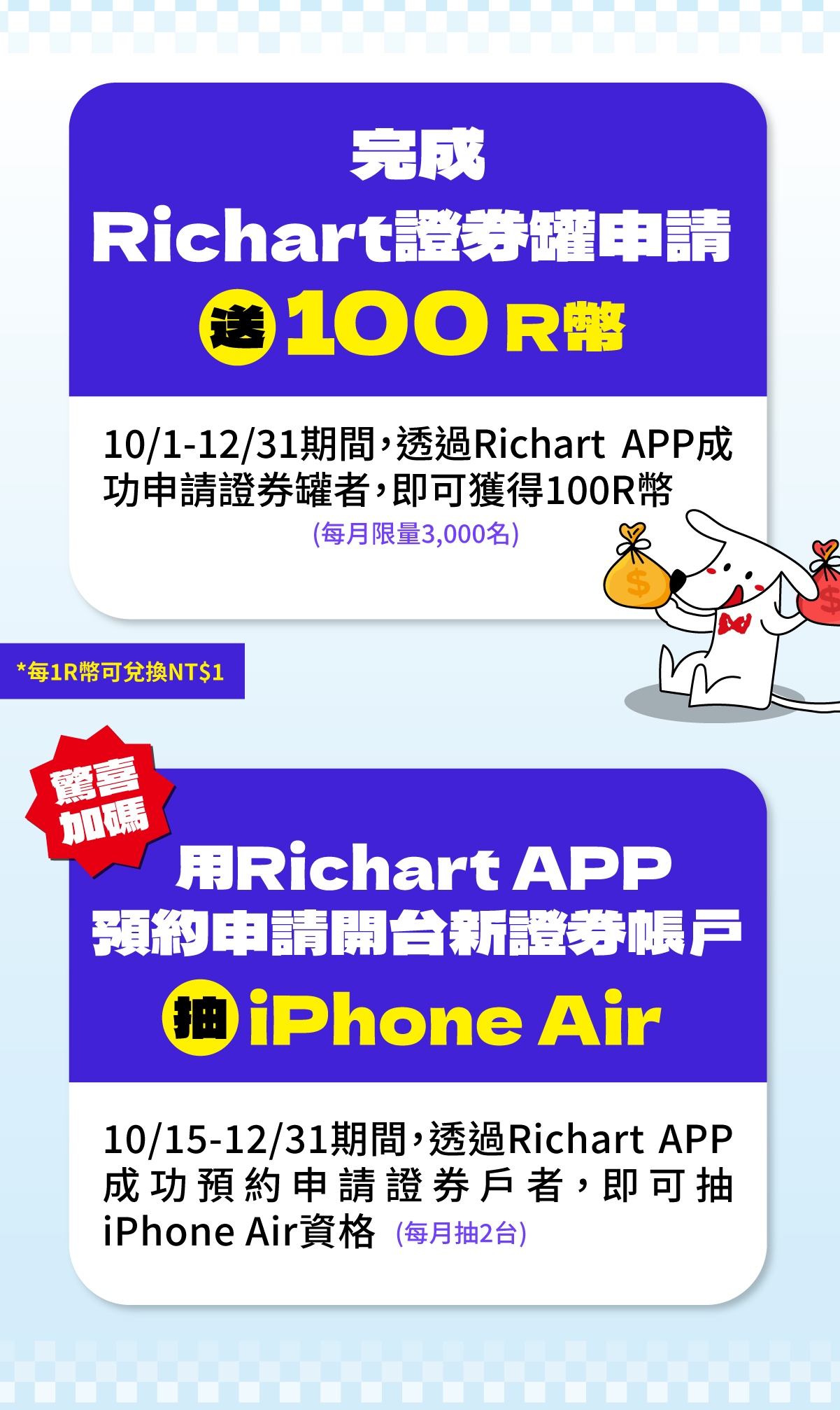 Richart服務由台新銀行提供,台新銀行保留隨時修改、變更、終止本活動及替換其他等值獎項之權利;本活動如有變更或終止時,將於Richart官網公告。若有其他未盡事宜,悉依Richart相關規定或解釋辦理,並得隨時補充公告之。