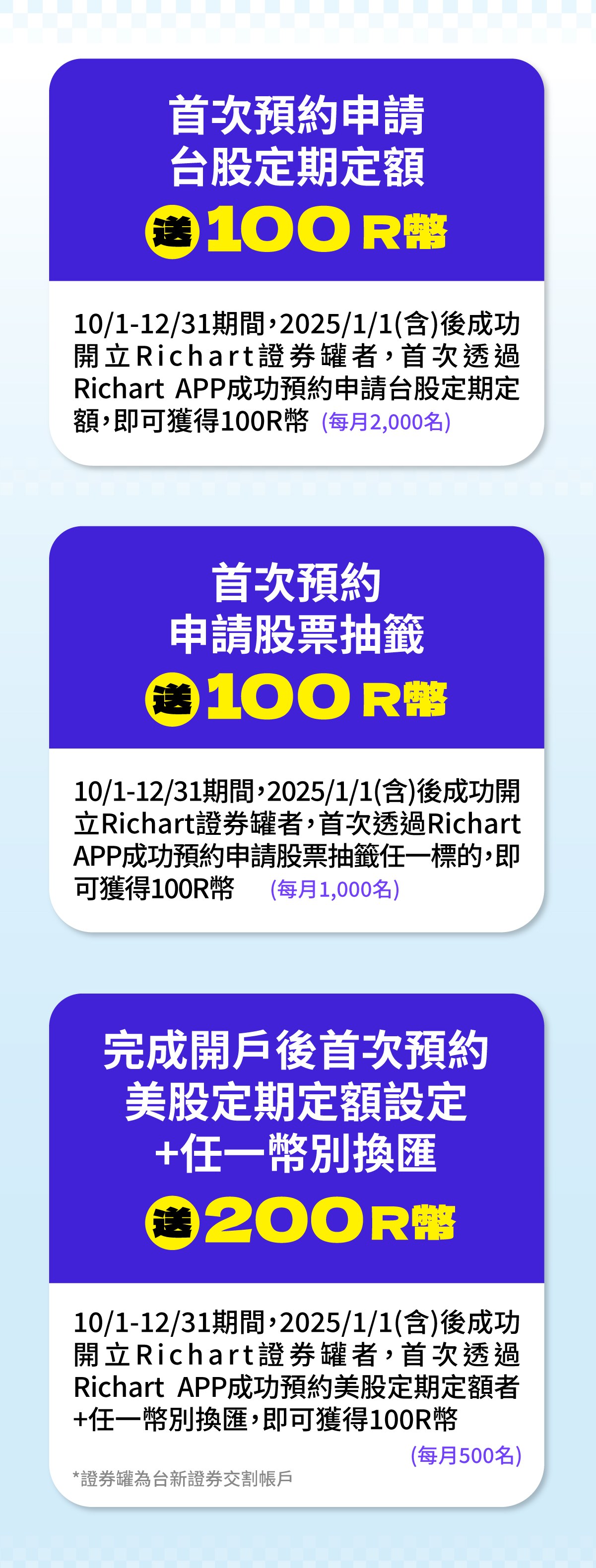 本活動限交割帳戶為Richart始符合贈獎資格; Richart帳戶包含Richart數位銀行綜合存款帳戶及同享Richart數位銀行綜合存款帳戶優惠之存款帳戶。