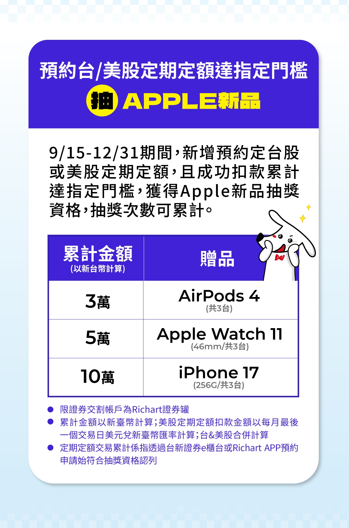 R幣由台新銀行提供;iPhone Air 贈品由台新銀行及台新證券提供;AirPods4、Apple Watch11、iPhone17 贈品由台新證券提供。
