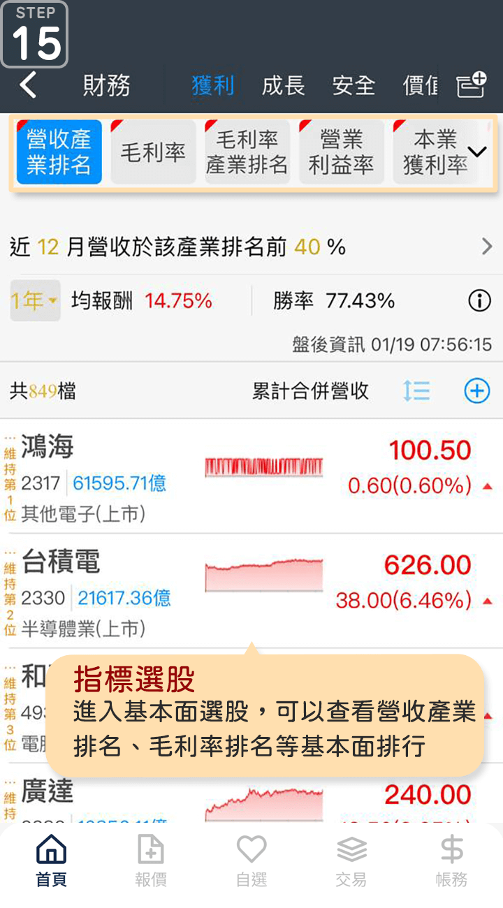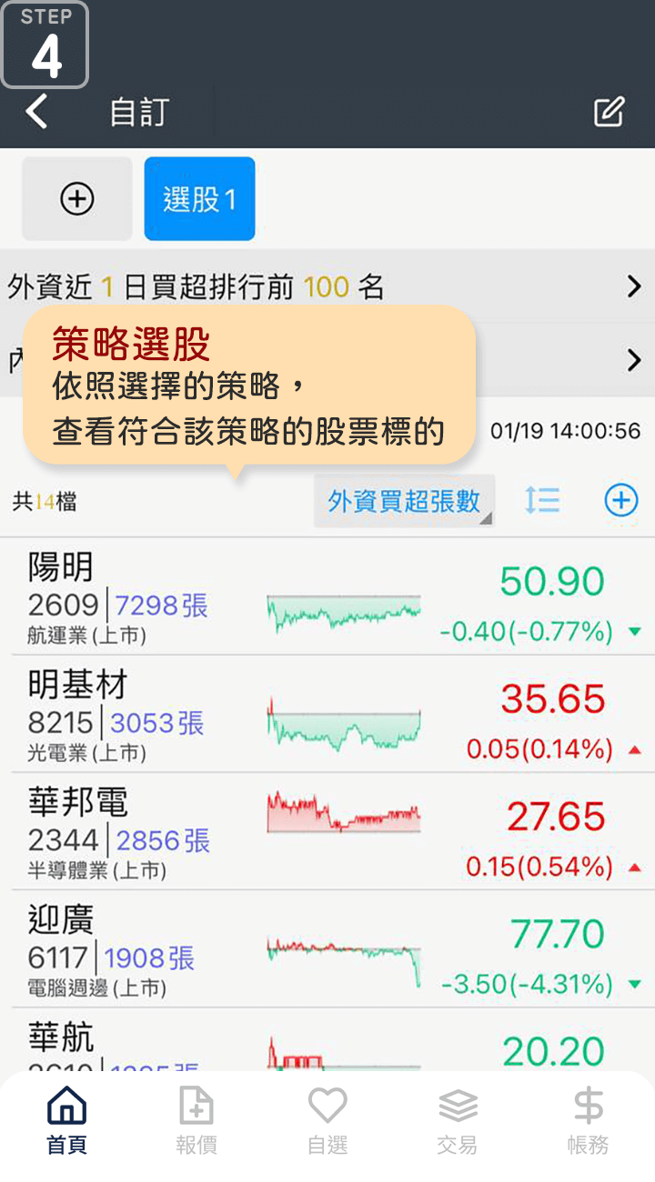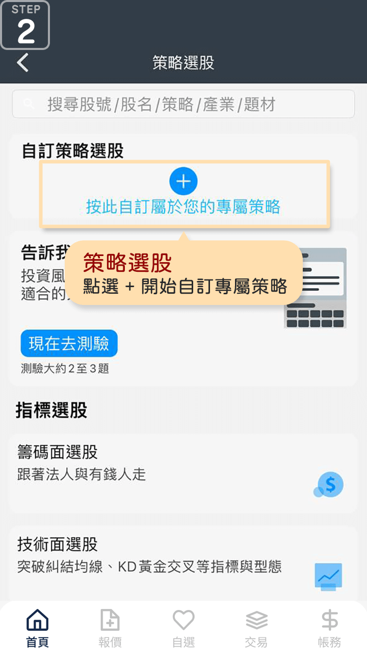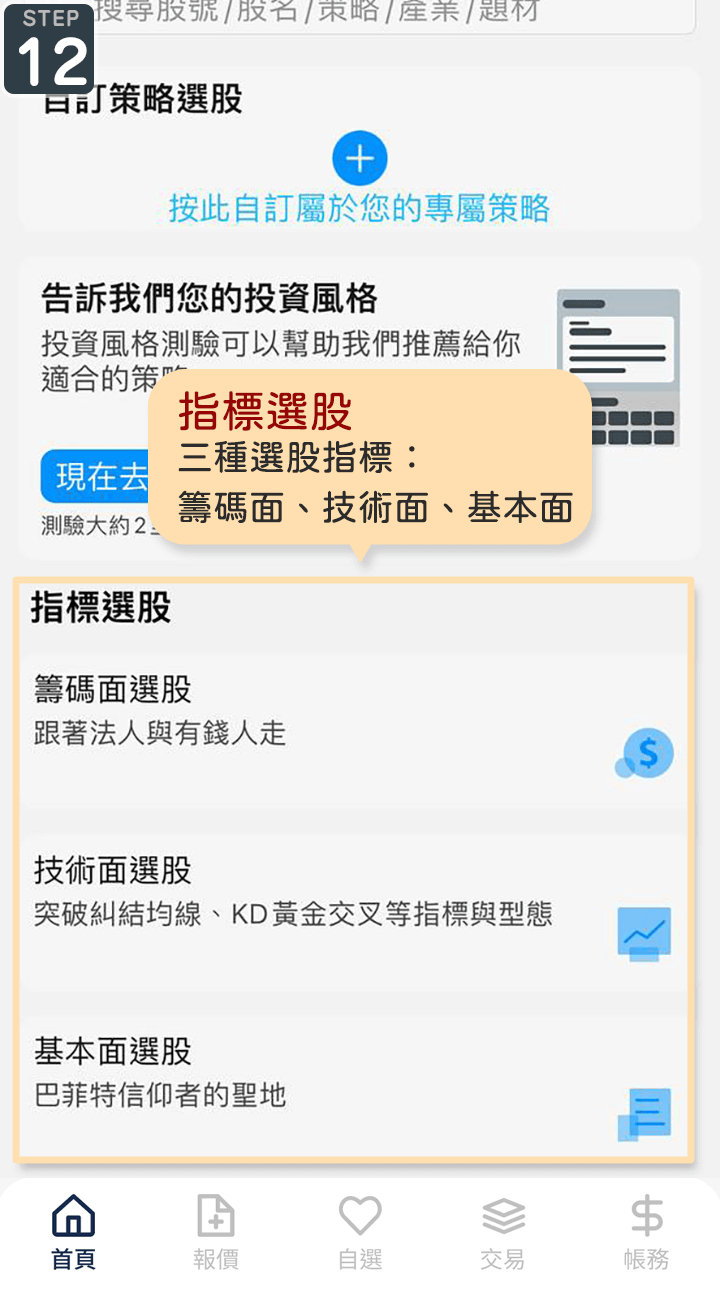 好富投APP策略選股預設462種策略及兩大常用選股方式,包含指標選股及看盤選股,亦可自訂選股條件,設定屬於自己的獲利方程式。