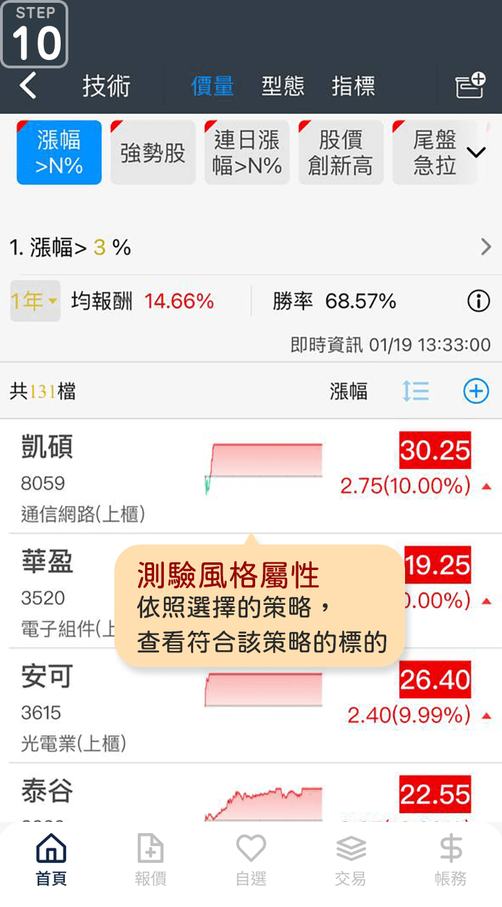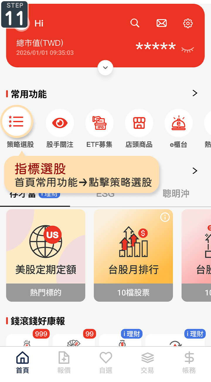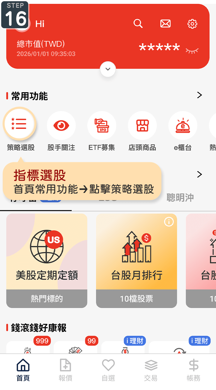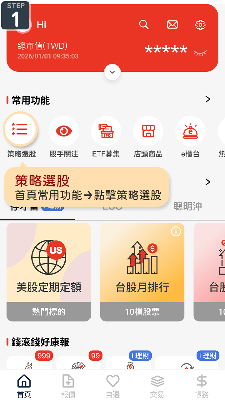 好富投APP策略選股預設462種策略及兩大常用選股方式,包含指標選股及看盤選股,亦可自訂選股條件,設定屬於自己的獲利方程式。