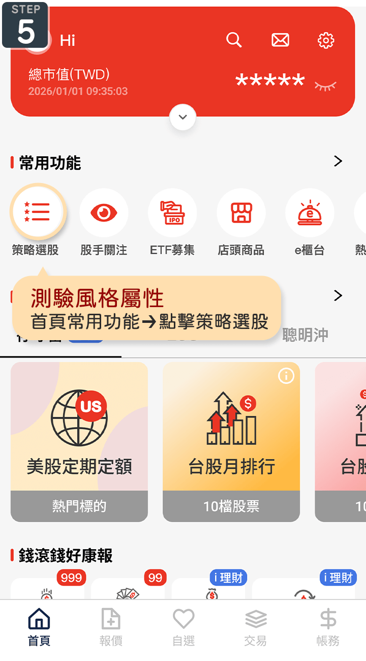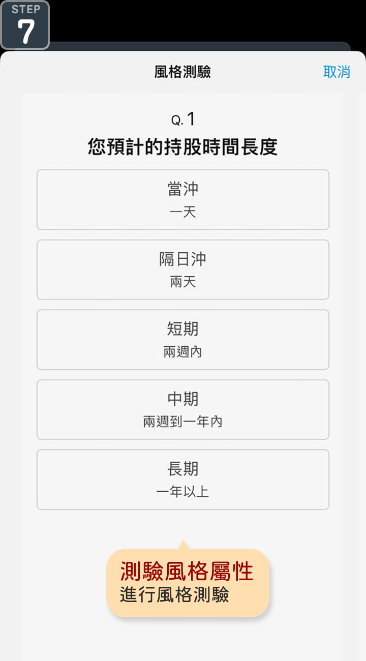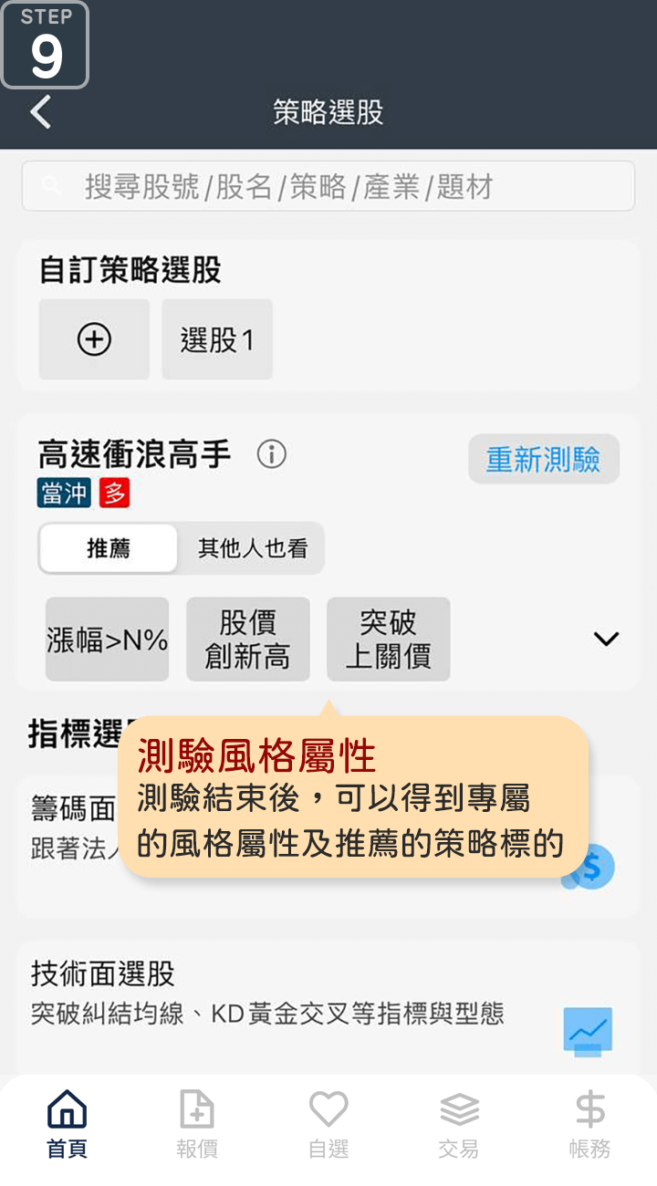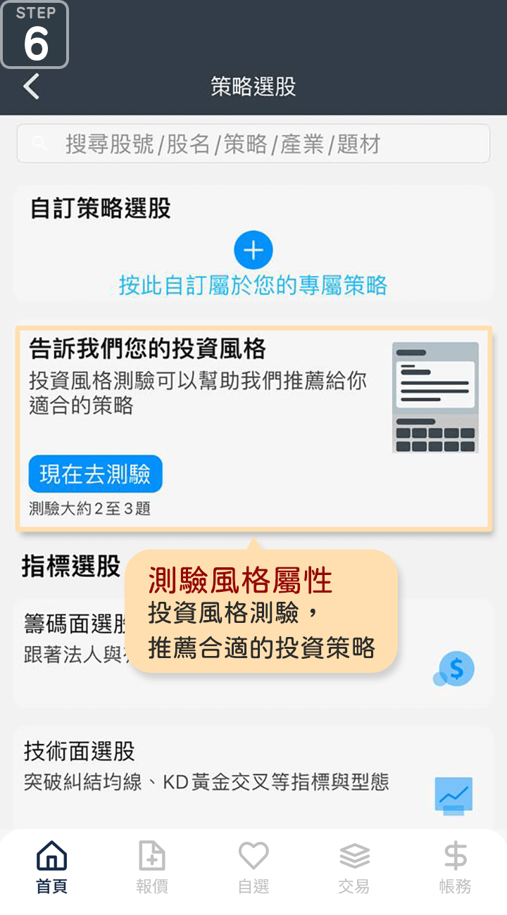 此外,策略選股最上方供線上測驗個人投資風格屬性,找出個人的投資風格,並獲得個人風格的投資標的。