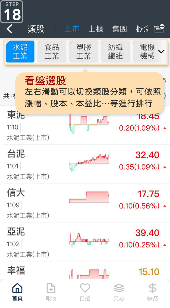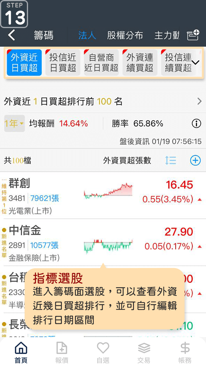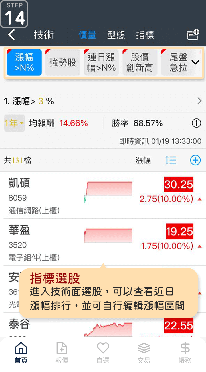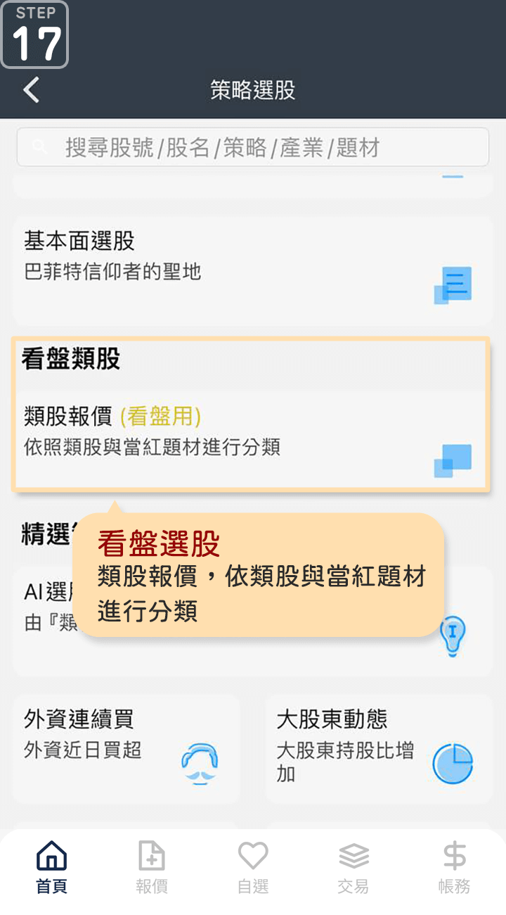 指標選股包含籌碼面、技術面及基本面;看盤選股依照類股於當紅題材進行分類。