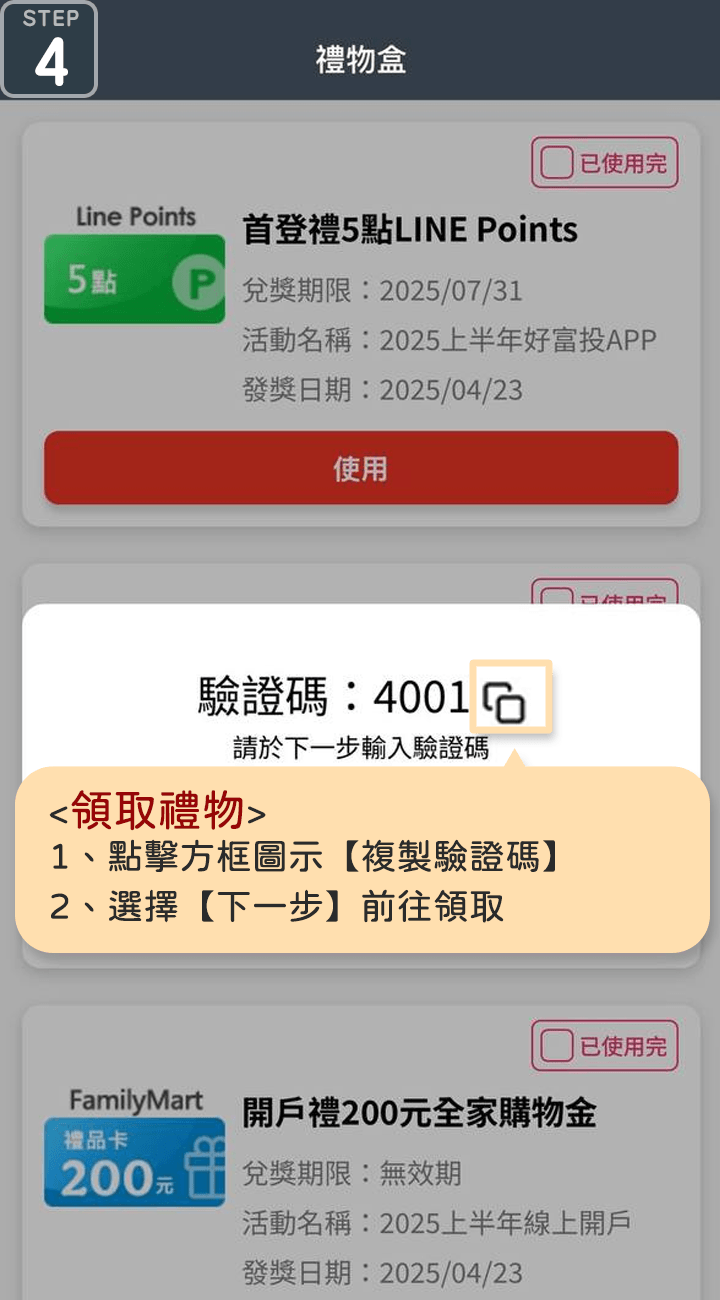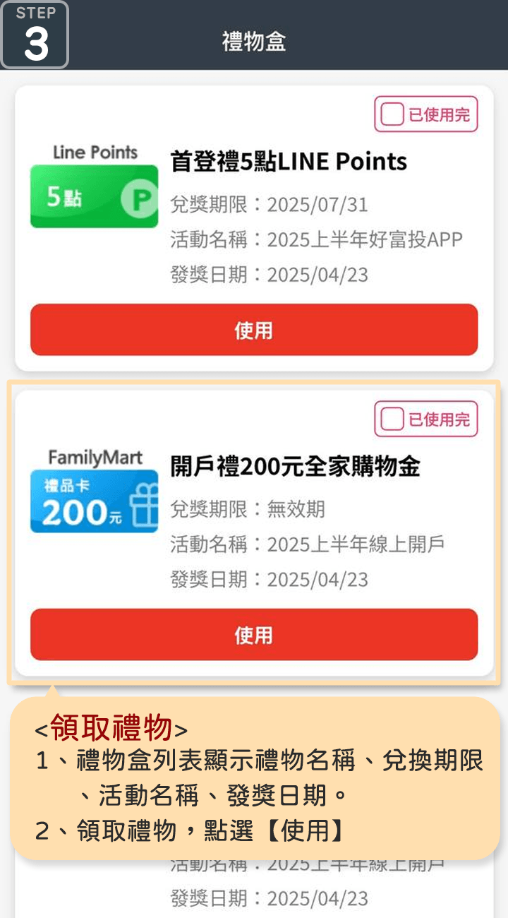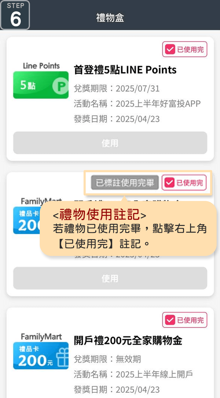 使用完畢後,還可以自行標註「已使用完」,方便管理已兌換與待兌換禮物。讓您的投資旅程不僅方便,更多了份驚喜與貼心陪伴!